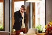 Afrykański mężczyzna obiad w worjing z laptopa w kawiarni.