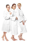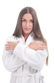Piękna młoda kobieta w szlafrok po prysznic na białym tle