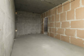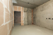Niewielka kuchnia w nowym budynku, gołe ściany betonowe i otynkowany, komunikacji
