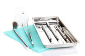 zestaw narzędzi stomatologicznych z protezy na niebieskim tle