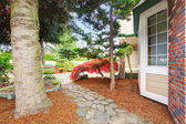 Ścieżki ogrodowe wzdłuż domu wypielęgnowane podwórku