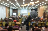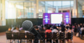Mikrofon na niewyraźne zdjęcie sali konferencyjnej