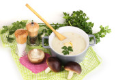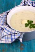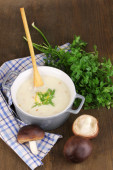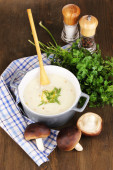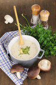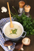 tłuczone ziemniaki w rondlu z składników na drewnianym stole