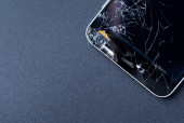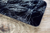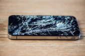 Wyświetlacz smartfona z tłuczonym szkłem na stole wodden
