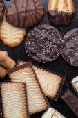 Pliki cookie różne na czarnym tle. Rano pyszne przekąski dla śniadania, brunche oraz lunche. Smaczne, słodkie i fast food