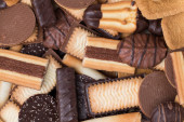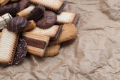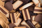 Pliki cookie różne na czarnym tle. Rano pyszne przekąski dla śniadania, brunche oraz lunche. Smaczne, słodkie i fast food