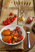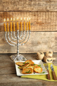 Latkes i twaróg na talerzu i na serwetce niebieski, chanukia
