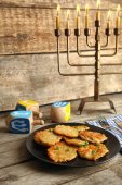 Latkes na talerzu, Chanuka, miseczki z mlekiem, po stronie biały obrus Zobacz