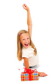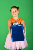 Mała dziewczynka z pudełko z kokardą czerwony w sukience.