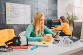 Kobiet pracujących na komputerze w biurze, jak i w pierwszym planie dziewczyna picia kawy i przy użyciu smartfona