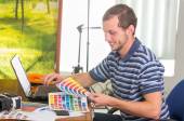 Zbliżenie na przystojny młody mężczyzna, ubrany w niebieską koszulkę, za pomocą dźwigni do bindowania dokumentów z segregatora z tworzyw sztucznych za pomocą pierścienia bindownicy