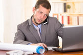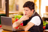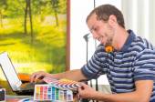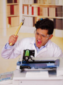 Zbliżenie na przystojny młody mężczyzna, ubrany w niebieską koszulkę, za pomocą dźwigni do bindowania dokumentów z segregatora z tworzyw sztucznych za pomocą pierścienia bindownicy