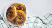 Wiele świeżych pełnoziarniste bułeczki z makiem, sezamem i składniki na śniadanie na jasnym tle betonu lub kamienia.