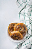 Zdjęcie "Wiele świeżych pełnoziarniste bułeczki z makiem, sezamem i składniki na śniadanie na jasnym tle betonu lub kamienia." może być wykorzystywane do celów osobistych i komercyjnych zgodnie z warunkami zakupionej licencji Royalty-free. Obraz jest dostępny do pobrania w jakości wysokiej rozdzielczości do 5760x3840.
