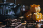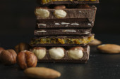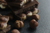 Zdjęcie "Czekolady kawałki i orzechy na ciemnym tle Łupek z miejsca kopii. Czekoladowe tło. Widok z góry. Stonowanych" może być wykorzystywane do celów osobistych i komercyjnych zgodnie z warunkami zakupionej licencji Royalty-free. Obraz jest dostępny do pobrania w jakości wysokiej rozdzielczości do 5760x3840.