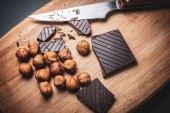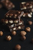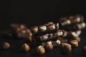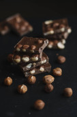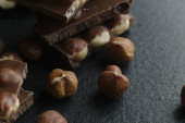 Czekolady kawałki i orzechy na ciemnym tle Łupek z miejsca kopii. Czekoladowe tło. Widok z góry. Stonowanych