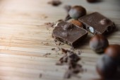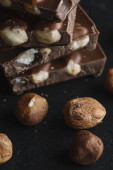 Czekolady kawałki i orzechy na ciemnym tle Łupek z miejsca kopii. Czekoladowe tło. Widok z góry. Stonowanych