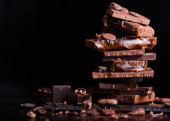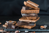 Czekolady kawałki i orzechy na ciemnym tle z miejsca kopii. Czekoladowe tło. Stonowanych