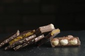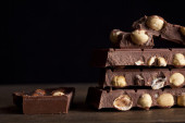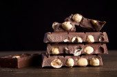 Czekolady kawałki i orzechy na ciemnym tle z miejsca kopii. Czekoladowe tło. Stonowanych