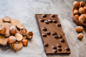 Czekolady kawałki i orzechy na ciemnym tle z miejsca kopii. Czekoladowe tło. Stonowanych