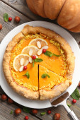 Pumpkin pie - tradycyjny deser amerykański, przyozdobionym z orzechów pekan