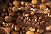Czekolady kawałki i orzechy na ciemnym tle z miejsca kopii. Czekoladowe tło. Stonowanych