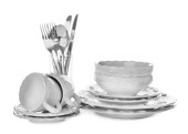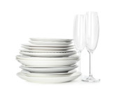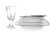 Szklanki, sztućce i naczynia ceramiczne na białym tle