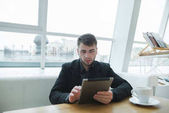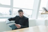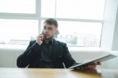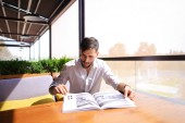 Przystojny Brodaty mężczyzna siedzi przy oknie w nowoczesną stylową kawiarnię i czytania magazynu. Przerwa obiadowa, czytając.