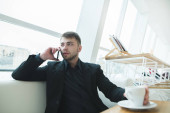 Pozytywny człowiek w garniturze i brodę mówi przez telefon na tle metalowe ściany i uśmiecha się. Portret firmy.