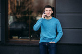 Zdjęcie "Pozytywny człowiek w garniturze i brodę mówi przez telefon na tle metalowe ściany i uśmiecha się. Portret firmy." może być wykorzystywane do celów osobistych i komercyjnych zgodnie z warunkami zakupionej licencji Royalty-free. Obraz jest dostępny do pobrania w jakości wysokiej rozdzielczości do 5760x3840.