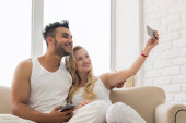 Młoda para piękny stojak okna, biorąc zdjęcie Selfie na inteligentnego telefonu komórkowego