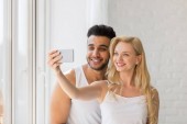 Młoda para piękny stojak w pobliżu duże okno, człowiek hiszpanin dać kobieta niespodzianka obecny kopertę z wstążki