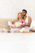 Młoda para w pobliżu okna szczęśliwy uśmiech człowiek hiszpanin kobieta trzymać obecny kopertę z miłośników wstążki w sypialni