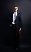 Portret mężczyzny biznesowych z teczki na białym na czarnym bac