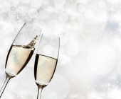 Dwie szklanki piany szampana na tle świąteczne girlandy, miejsca kopiowania tekstu po prawej stronie