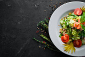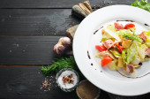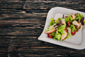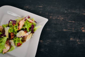 Sałatka jarzynowa i pokrojone w kostkę mięso. Na tle drewnianych. Widok z góry. Wolna przestrzeń.