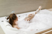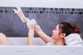 Zdjęcie "Kobieta, mycie ramię z gąbką w wanna w łazience" może być wykorzystywane do celów osobistych i komercyjnych zgodnie z warunkami zakupionej licencji Royalty-free. Obraz jest dostępny do pobrania w jakości wysokiej rozdzielczości do 5760x3840.