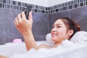 Kobieta przy użyciu telefonu komórkowego w wanna w łazience