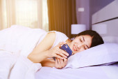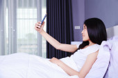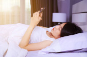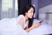 Kobieta przy użyciu telefonu komórkowego w wanna w łazience
