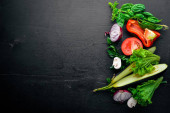 Przygotowanie do gotowania, świeże warzywa na tle drewnianych. Widok z góry. Ilość wolnego miejsca dla tekstu.