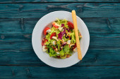 Zdjęcie "Sałatka grecka. Świeże warzywa na tle drewnianych. Widok z góry. Ilość wolnego miejsca dla tekstu." może być wykorzystywane do celów osobistych i komercyjnych zgodnie z warunkami zakupionej licencji Royalty-free. Obraz jest dostępny do pobrania w jakości wysokiej rozdzielczości do 5760x3840.