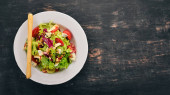 Sałatka grecka. Świeże warzywa na tle drewnianych. Widok z góry. Ilość wolnego miejsca dla tekstu.