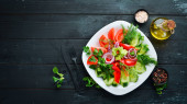 Sałatka z łososiem i świeże warzywa i zioła. Dania kuchni włoskiej. Widok z góry. Na podłoże drewniane.