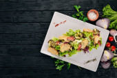 Zdjęcie "Dyni i świeżymi warzywami sałatka. Dania kuchni włoskiej. Widok z góry. Ilość wolnego miejsca dla tekstu. Na tle drewnianych." może być wykorzystywane do celów osobistych i komercyjnych zgodnie z warunkami zakupionej licencji Royalty-free. Obraz jest dostępny do pobrania w jakości wysokiej rozdzielczości do 5760x3840.