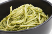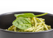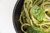 Makaron spaghetti z sosem pomidorowym w białe naczynie w kształcie bańki czat, na białym tle.