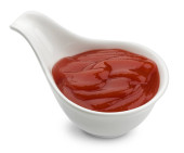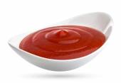 Keczup na białym tle na białym tle, sos pomidorowy w misce