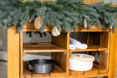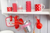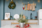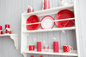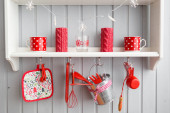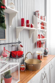 Zdjęcie "półki z kuchni. Lekka kuchnia szary i czerwony Boże Narodzenie wystrój. Przygotowując obiad w domu na koncepcji kuchni." może być wykorzystywane do celów osobistych i komercyjnych zgodnie z warunkami zakupionej licencji Royalty-free. Obraz jest dostępny do pobrania w jakości wysokiej rozdzielczości do 5760x3840.