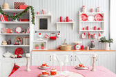 półki z kuchni. Lekka kuchnia szary i czerwony Boże Narodzenie wystrój. Przygotowując obiad w domu na koncepcji kuchni.
