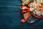 Zestaw z kuchni azjatyckiej. Risotto z krewetkami makaron z warzywami. Ryby i owoce morza. Na podłoże drewniane tekstury. Widok z góry. Wolna przestrzeń.