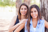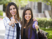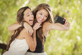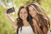 Dwie koleżanki atrakcyjne mieszanej rasy, przy użyciu ich inteligentne telefony komórkowe dla Selfie na zewnątrz